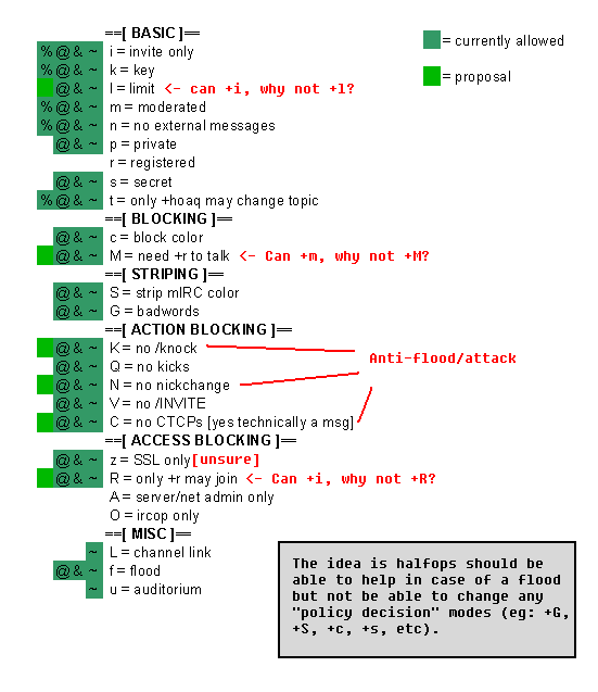 Done. Used the table from 2003. I noticed we have a 'no notice' mode since then (debatable, not included) and also +j. I don't think we should halfops change +j since we don't allow them to change +f either. https://github.com/unrealircd/unrealircd/commit/efc63dff8127f00aedb4e143796e15dd3bc5b0ea ** Permit halfops to set more modes than before. The idea is halfops should be able to help out in case of a flood but not be able to change any 'policy decission' modes such as +G, +S, +c, +s. The following modes are now permitted to halfops: +iklmntMKNCR (was: +ikmnt) ** EDIT: oh for accuracy, +beI is also permitted (no change). |